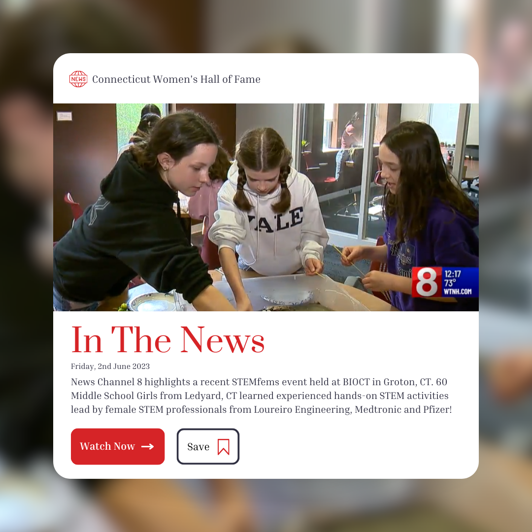 CWHF STEMfems In The News! CWHF was recently highlighted by WTNH News Channel 8! Watch and learn about how we are helping to close the gender gap in STEM with our hands-on program STEMfems for middle school girls. Watch Now! CT Women's Hall of FameJune 12, 2023 Facebook0 Twitter LinkedIn0 Reddit Tumblr Pinterest0 0 Likes